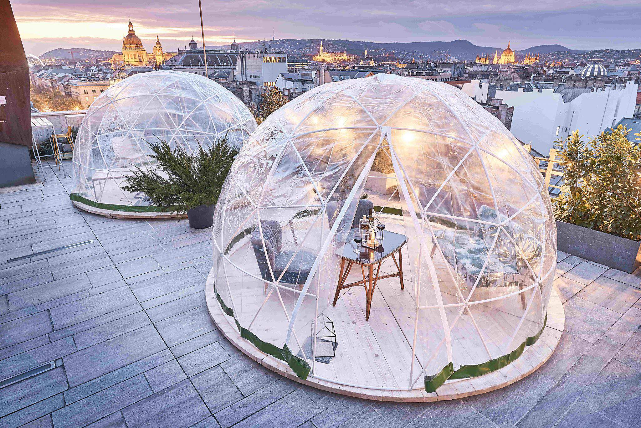 Igloos,本质上是透明的拉链圆顶,用电加热器保持温暖,但也可以依偎在覆盖在时尚家具上的毯子上屋顶上设置了六个igloos,可以容纳八到九个人以及三张桌子“每个设计都有一个单独的主题,从滑雪木屋别致到冬季棕榈屋”。