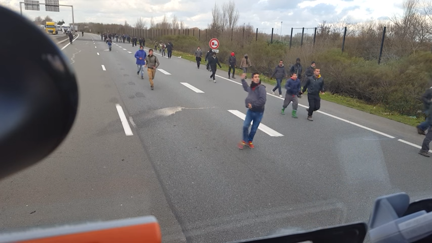1名匈牙利卡车司机在加来失去耐心,司机在YouTube上发布了一段视频,可以看到他把车轮转向在路上行走的难民, origo.hu 写道。