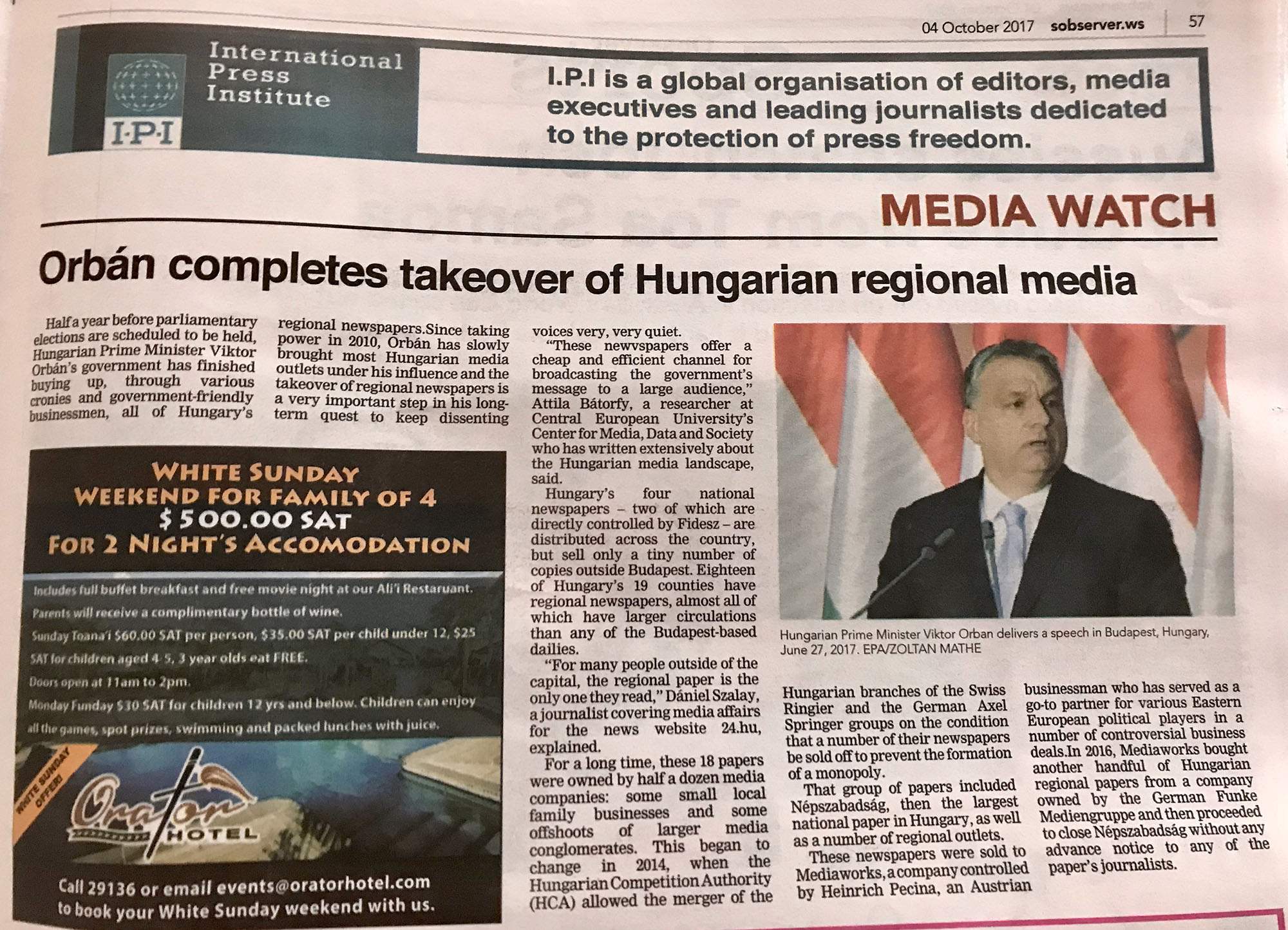 画《萨摩亚观察家报》周三号日报的其中一版,是萨摩亚最大的报纸,刊登了一篇半专栏文章,内容是维克多 · 奥尔班政府如何掌握县报纸(以及)。