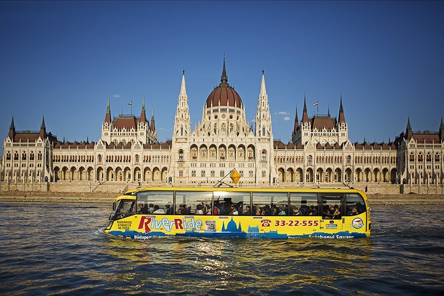 Welovebudapest。com的说法,布达佩斯唯一的两栖观光车在现代科技奇观中,它也适合地面和水上运输,巴士上展示了Pest的著名建筑,然后它去水面,穿过多瑙河。