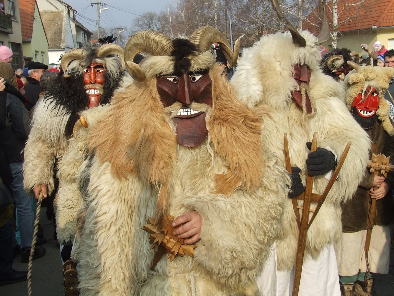 步(busó-walking)的传统元素没有改变:成年人穿着模糊的步舞曲、雕刻面具、奇特的配饰、响尾蛇和牛铃庆祝严峻的季节结束和春天的开始。