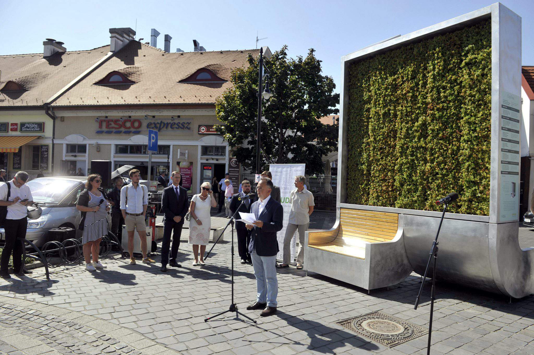 周四,布达佩斯北部繁忙的交汇处科洛西广场安装了一块用苔藓制成的空气过滤板。