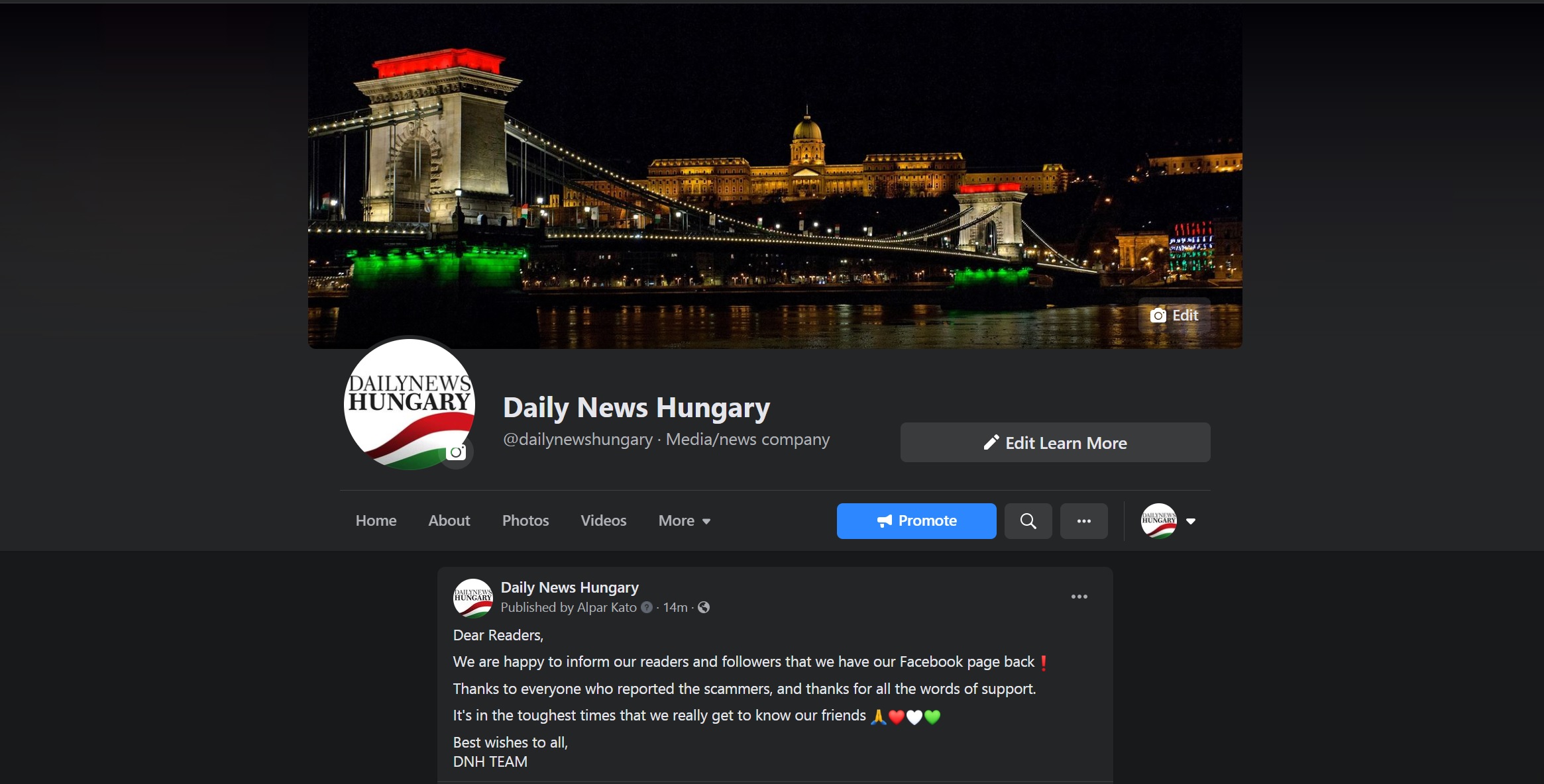 我们很高兴地通知我们的读者和关注者,我们有我们的 Facebook 页面(https://www.facebook.com/dailynewshungary) 回来了 82,000 名粉丝我们拿回了 Facebook 页面!