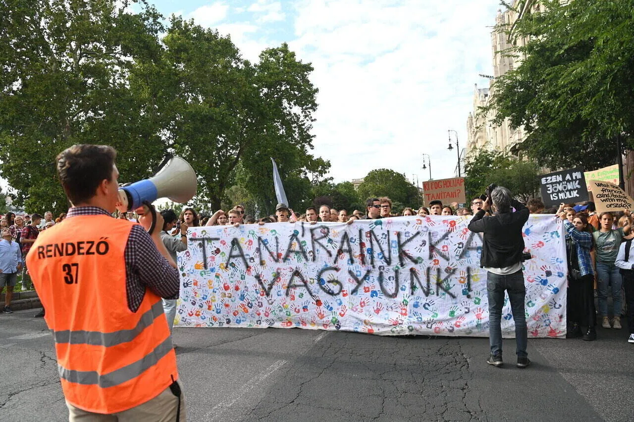 和“没有老师,没有未来!” 几个反对派政客,如布达佩斯市长格尔盖利·卡拉索尼、春季大选中联合反对派总理候选人佩特·马尔基-扎伊,以及帕贝塞德和社会党议员,都可以在抗议者中看到。