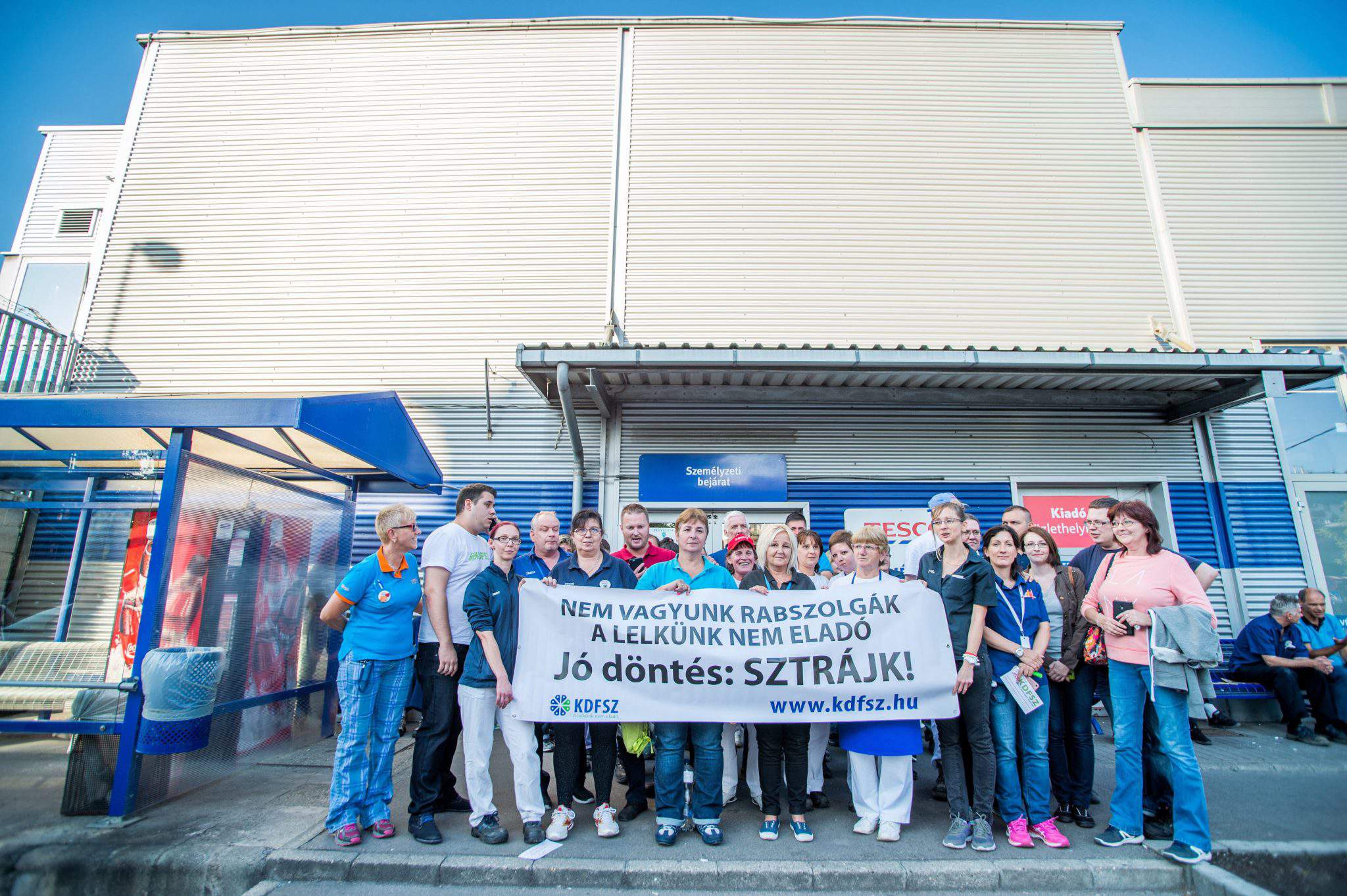工会呼吁罢工,因为他们要求加薪 25%、增加 15% 的员工的要求未得到满足。他们的要求还包括每月最低工资 200,000 福林(651 欧元),并且特易购应对承包商雇用的人数设定上限。