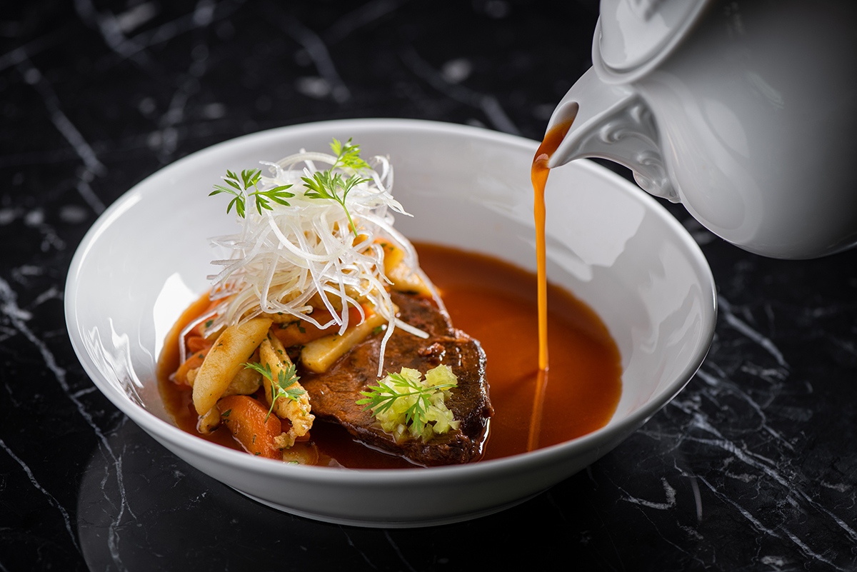 Hunter的炖菜是用和牛肉做的,配上乳清干酪馅的饺子和芥末酱,这样,这道菜还包括了沃尔夫冈的祖国奥地利的传统菜肴,传统的鸡肉辣椒粉用Hortobágy风格的糕点包裹,上面撒上胡桃木形状的Somló饺子,而Eszterhazy蛋糕则按照传统配方制作。