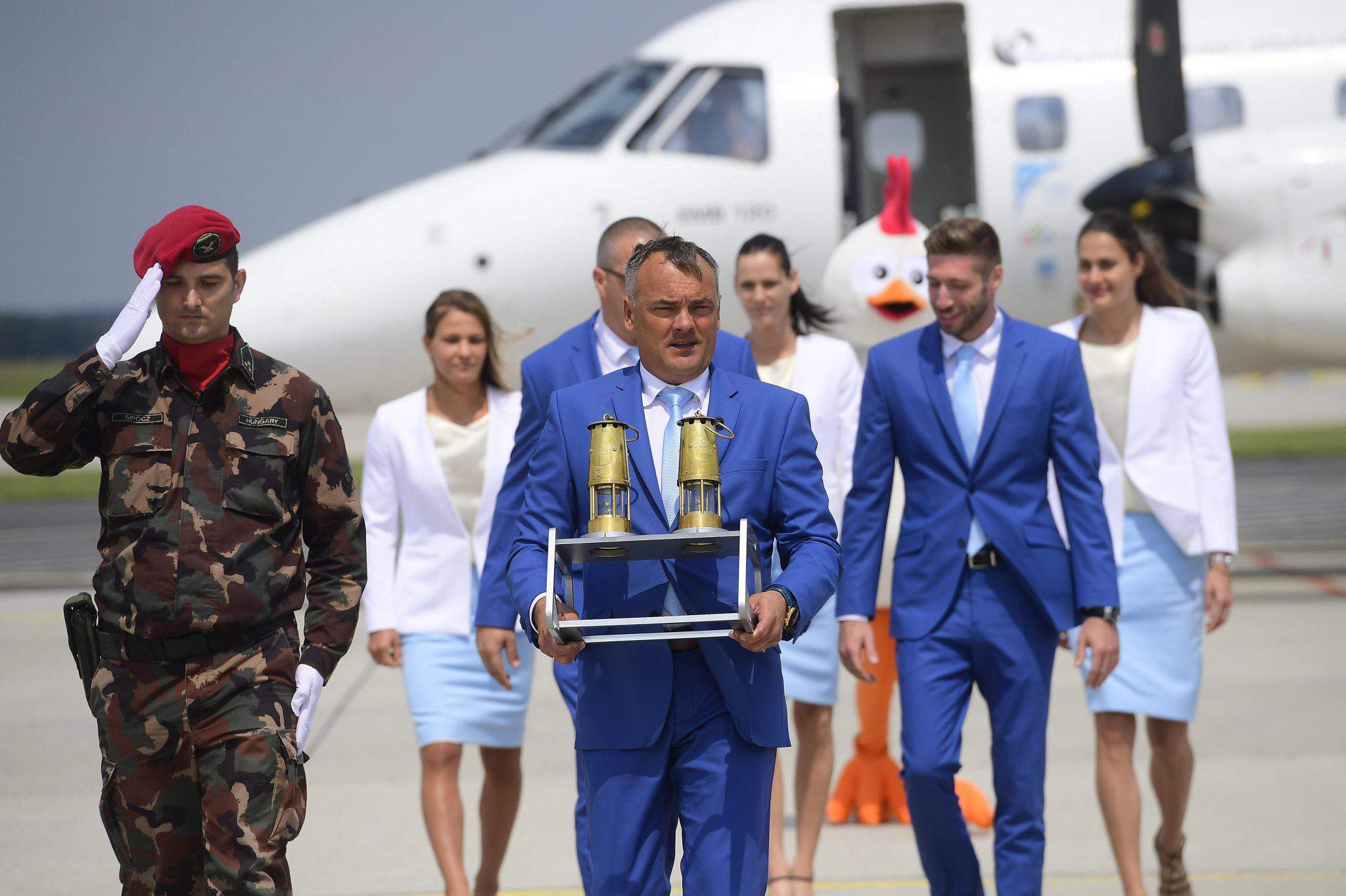 5月24日杰尔(MTI) 14届欧洲青年奥林匹克节(EYOF)的奥林匹克圣火周三抵达匈牙利西北部的杰尔-佩尔机场。