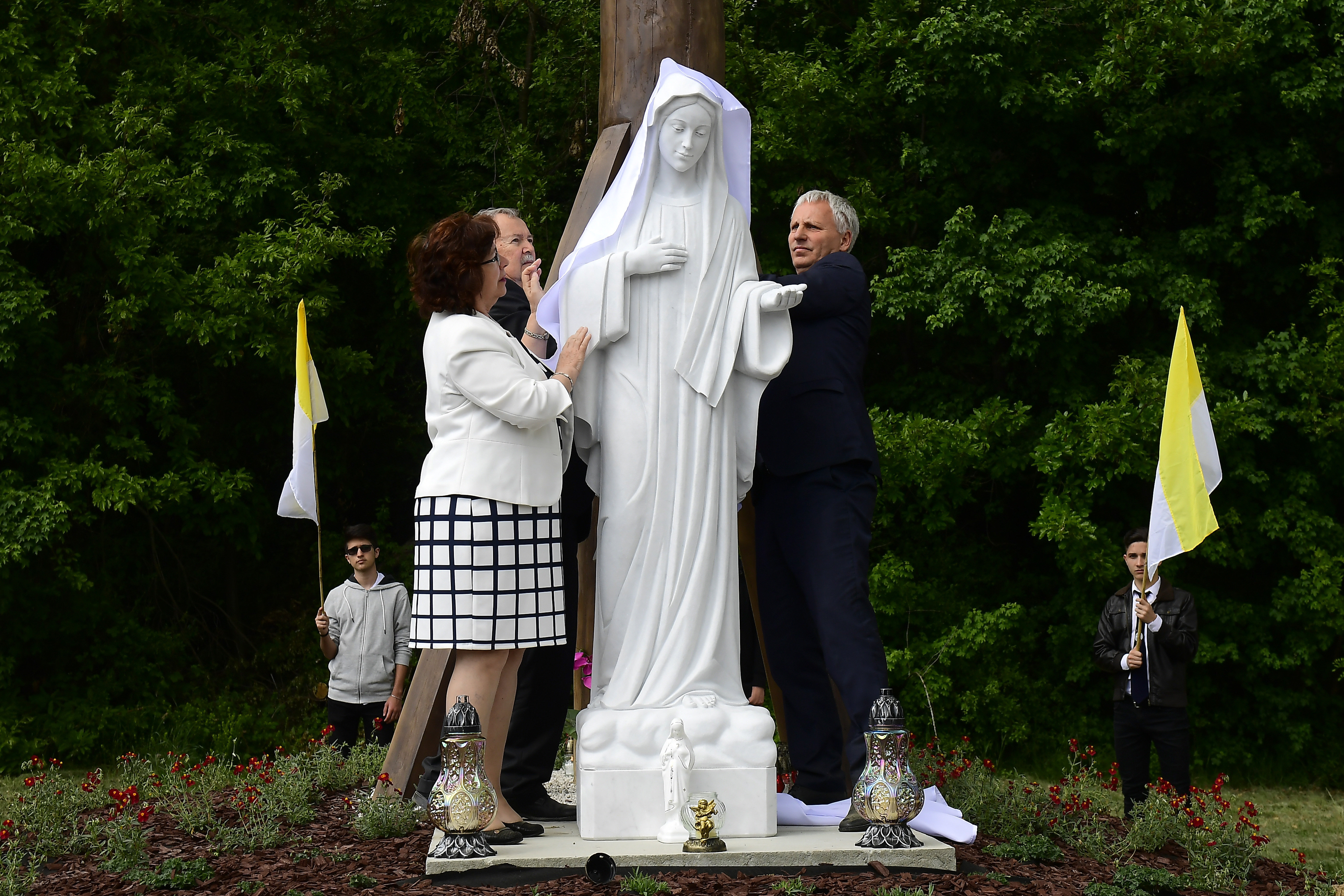 随后,参与者在巴拉顿凯雷斯图尔环岛竖立的纪念碑上致敬,那里安装了圣母玛利亚的雕像。