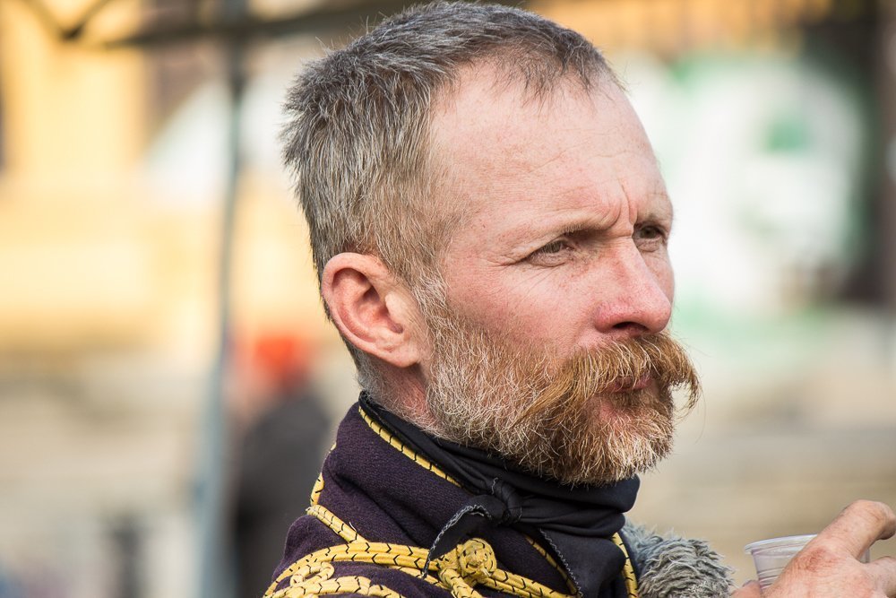 market摊位的另一边,沿着小堤,遇到了一群马,它们被绑成一片临时搭建的树木和绳索的畜栏,优雅的黄铜马镫从他们的皮马鞍上垂下来,树后有一群男人坐在一张桌子旁,他们穿着带有金色刺绣的复古蓝色制服,我想他们刚刚赢得了一场战斗,正在庆祝胜利,明火上有一大锅gulyás,这群人盛满了啤酒,葡萄酒和pálinka,小杯红酒和清白兰地在喝醉之前一起叮当作响,啤酒罐留在桌子上。