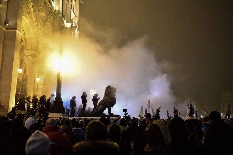 周四晚上,抗议者再次走上布达佩斯街头示威,反对“奴隶法”。示威活动和平开始,但警方随后用催泪瓦斯回应了激进的抗议者。 MTI通讯员从现场报道,尽管组织者在活动开始时要求参与者不要遮住脸部,但仍有几名抗议者戴着口罩,示威活动由自由大学和学生工会学生团体宣布。 下午6点,人群开始从议会附近的科苏特广场出发,在玛格丽特桥上越过布达,沿着河岸行进,然后通过链桥返回佩斯。 Markó街的检察官办公室前停下人群,高呼“我们要求自由法院!”,然后搬回议会前的Kossuth广场,在那里他们几乎完全填满了广场,一些参与者手持匈牙利和欧盟旗帜,以及反对派的Momentum,Jobbik,LMP和Parbeszed政党的旗帜。 警察在议会的台阶上排起了多条防线来保护这座建筑。 警察局长表示,警方已被指示佩戴防护装备,包括防弹盾和头盔。 照片:MTI 照片:MTI 照片:MTI 照片:MTI 照片:MTI