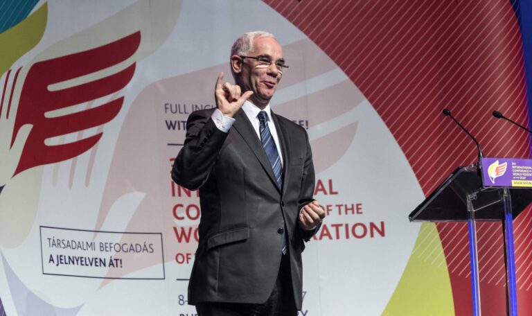 签 语言 是听力正常人和听力障碍者之间的桥梁,人力资源部长佐尔坦 · 巴洛格周四在布达佩斯举行的世界聋人联合会第三届国际会议上的讲话中说。 11月8日至10日举行,会议题为“通过手语实现全面融合!”,接待了来自80多个国家的约700人。 Balog说,匈牙利政府正在努力,以便所有 残疾公民 应感到自己受到赞赏和完全接受,他指出,匈牙利是第一个批准联合国残疾人权利公约的国家,说聋人有权在生活的各个领域获得手语信息,政府保障手语教育的权利,并支持手语视频口译,有几亿福林,部长说。 匈牙利聋人和听力障碍者协会(SINOSZ)主席阿达姆·科萨表示,手语是聋人充分融入社会的唯一手段。 他说,SINOSZ 正在致力于全国范围内的匈牙利语双语教育和听力障碍儿童手语教育。