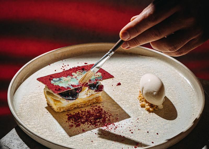 Zsombor Barakonyi 的画作不仅仅是装饰–它们被转化为可食用的体验。主厨巴纳巴斯-哈克(Barnabás Hack)将艺术作品的色彩、形式和情感色调诠释到菜肴中。黄油就像画家的调色板。在一道羊里脊的菜肴中,客人用吸管在食物上 “涂抹 “绿色的油。在另一道菜中,食客用刷子刷掉表面的粉末,露出下面的味道。用餐体验成为一种互动,表明当代艺术不仅可以观赏,还可以品尝。