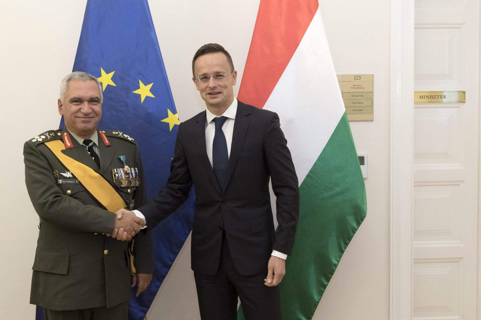Außenminister Péter Szijjártó und Michail Kostarakos, Leiter der Europäische Union Militärausschuss (EUMC), am Donnerstag die Notwendigkeit der Stärkung der Sicherheitsstruktur der EU erörtert.
