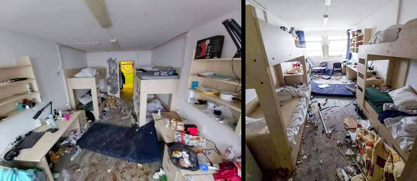 Bis Dienstagmorgen haben Studenten viele Teile im Schlafsaal gewaltsam abgestürzt. Sie warfen Stühle, Betten und Matratzen weg, während sie in einem der Räume begannen, die Wände mit einem Hammer zu zerstören.