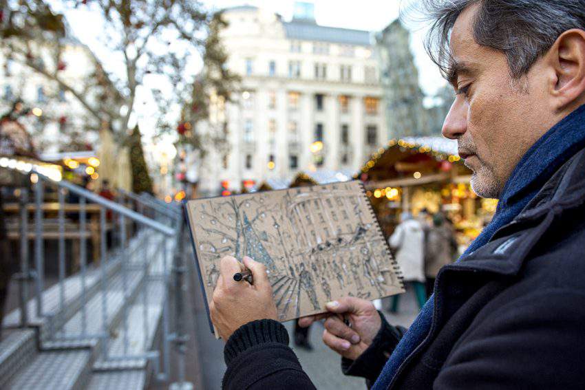 Ich wurde in Budapest geboren, wuchs aber in einem Vorort auf und kannte die Innenstadt nicht wirklich. Ich besuchte die weiterführende Schule in Sárospatak und zog zurück nach Budapest, um zur Universität zu gehen. Ich lebte in Zugló, also musste ich jeden Tag nach Zugliget pendeln, um meinen Universitätsunterricht zu besuchen. Ich fühlte mich nicht gut Später bekam ich einen Job in Andrássy út, also zog ich nach Dob utca. Ich war erstaunt über die hektischen Vibes der Stadt. Dann verlor ich meinen Job und beschloss, Freiberufler zu werden. Ich begann, einen Kundenstamm aufzubauen und stellte meine Budapester Bilder in einer Ruinenbar aus. Ich verbrachte meine Freizeit damit, kleine Momente zu zeichnen.