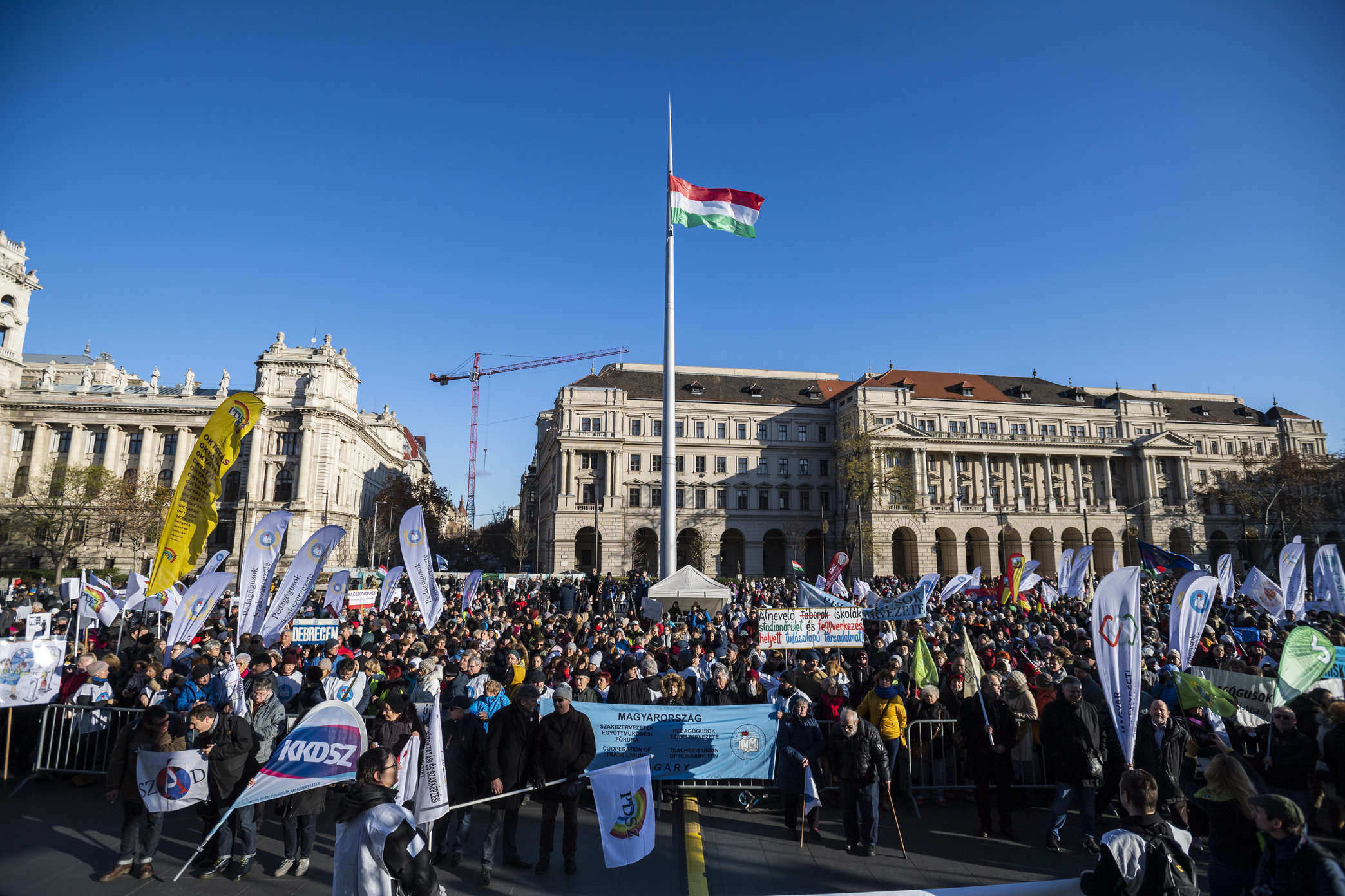 Lehrergewerkschaft PSZ hat am Samstag in Budapest eine Demonstration durchgeführt, mit Unterstützung anderer Lehrergewerkschaften, höhere Löhne und eine Entlastung der Lehrer gefordert.