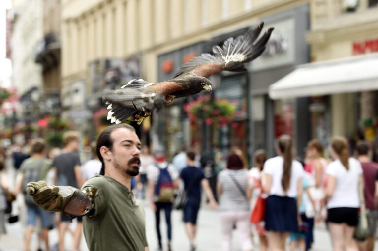 Greifvögel werden eingesetzt, um unordentliche Tauben vom Fußgängerbezirk Váci Street in Budapest fernzuhalten – Fotos