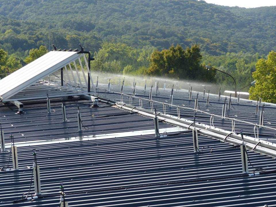 Ein ungarisches Unternehmen, das landwirtschaftliche Bewässerungssysteme vermarktet, hat eine nachhaltige Lösung für das Problem gefunden, mit deren Hilfe Arbeitskräfte eingespart und der drastische Energieverbrauch gesenkt werden könnten. Sie bewässern das Dach nicht einfach wie Ländereien, sondern haben ein sogenanntes Verdunstungssystem entwickelt, das mit Hilfe eines selbsteinstellenden Systems die benötigte Wassermenge verdampft. Auf diese Weise entsteht eine „Wasserfilmschicht“„So wird die Technologie“ WaterFilm-Technologie, erhielt seinen Namen – der nicht nur die Energie der Sonne abstrahiert, sondern auch die im Werksausgang erzeugte Wärme unterstützt.