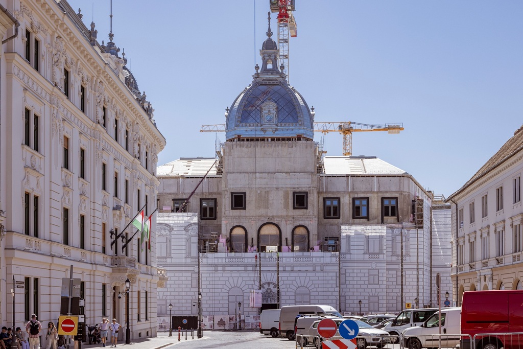 Sul segmento di parete corto della proiezione centrale occidentale, la scultura a nicchia con motivo a conchiglia è già stata completata, e sopra di essa è stato installato anche l’elemento decorativo con lo stemma della Slavonia. Gli elementi settentrionali più sorprendenti dell’edificio, che si affacciano su Piazza Dísz – il colonnato e il timpano – saranno montati nel corso di quest’anno.