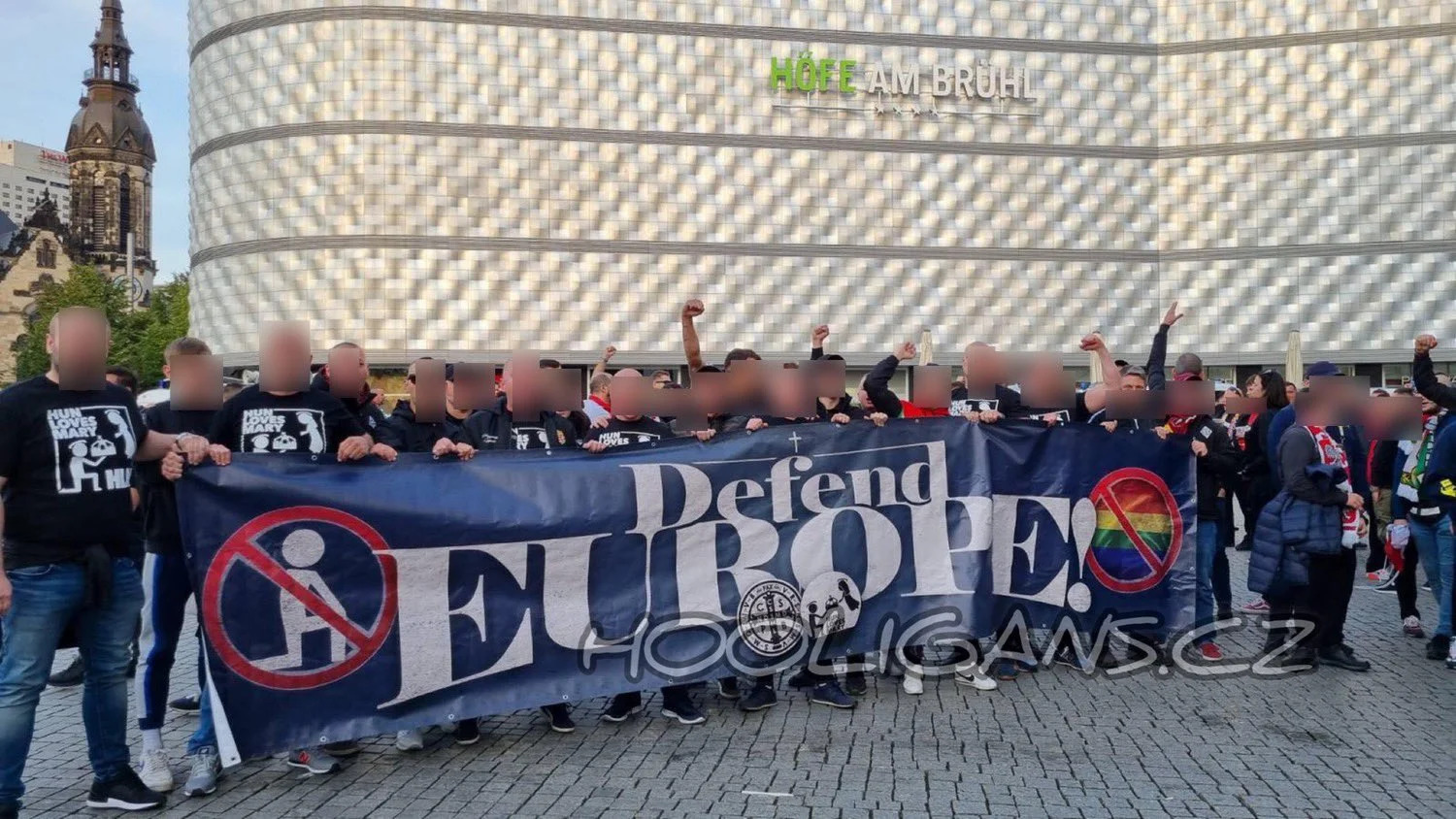 Il gruppo ungherese che si confrontava con i manifestanti portava una bandiera (Defend Europe”) sulla quale erano incrociati il segno del movimento LGBTQ e del movimento Black Lives Matter Ecco la foto:
